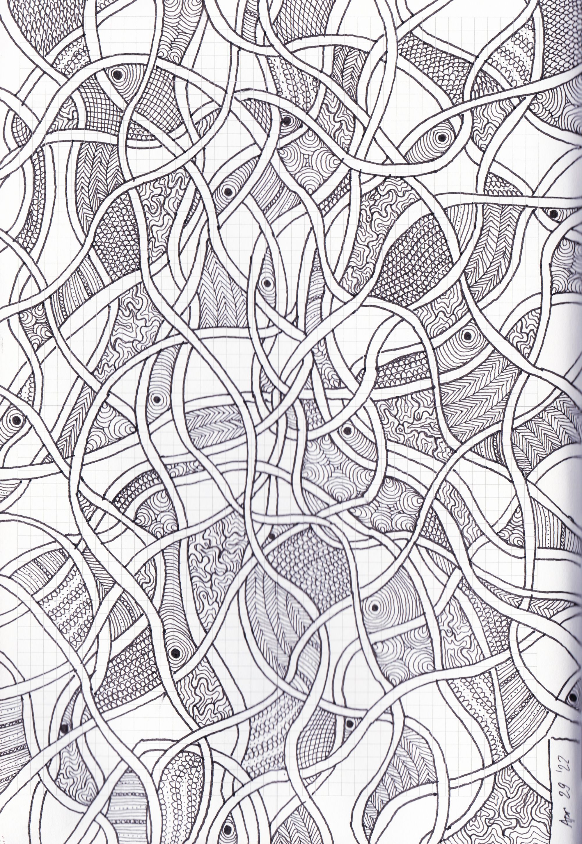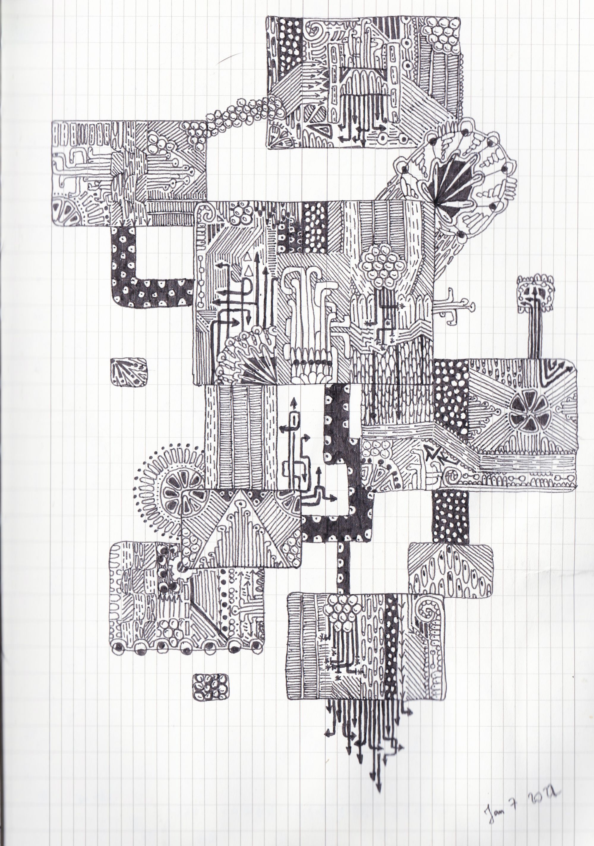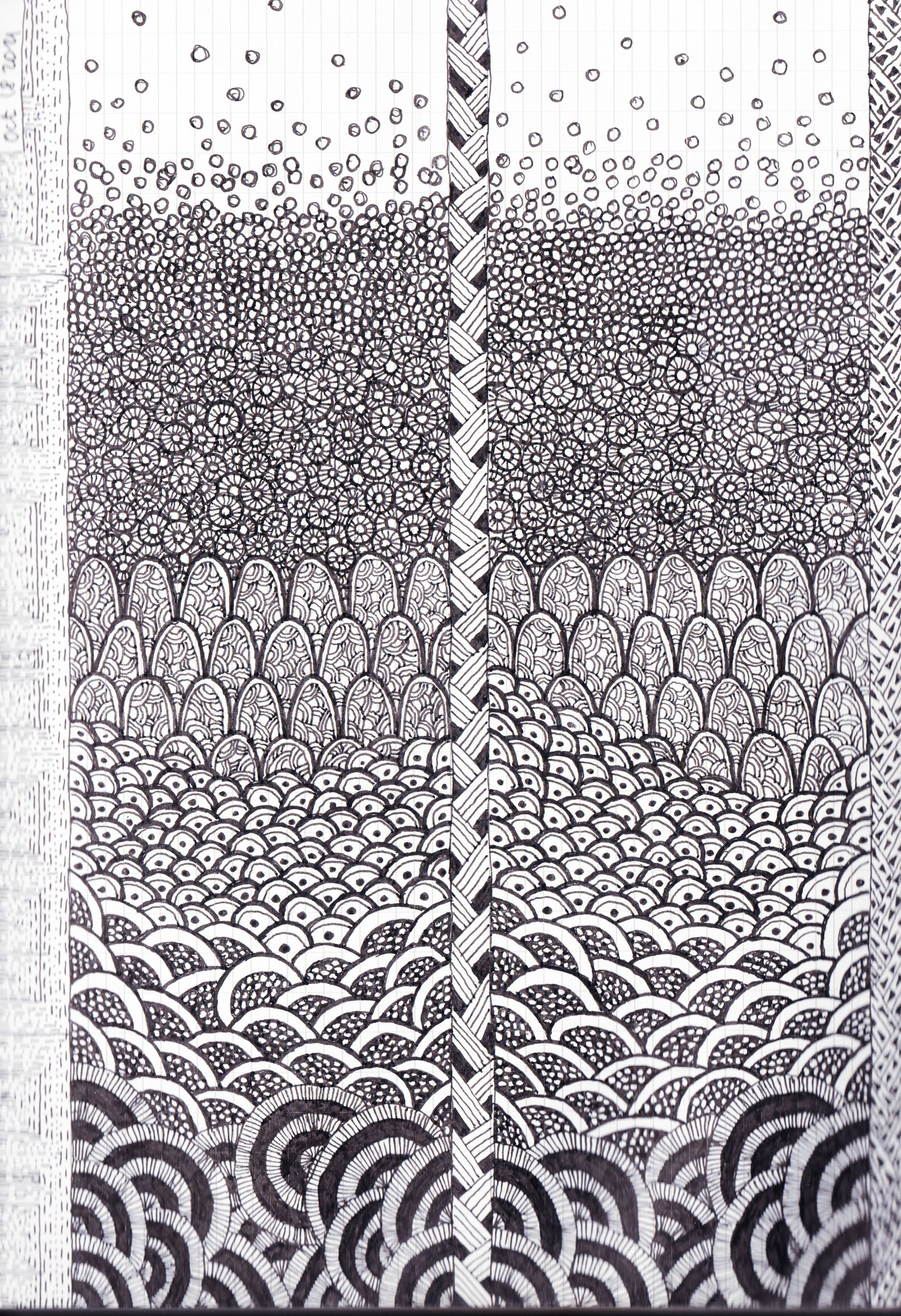 I remembered about a technique I used to practice when I was a teenager - very simple ink patterning - and I become curious if I can develop it further. I saw works of great masterity using the technique in Collection de l'Art Brut in Lausanne so I had a good inspiration too.
