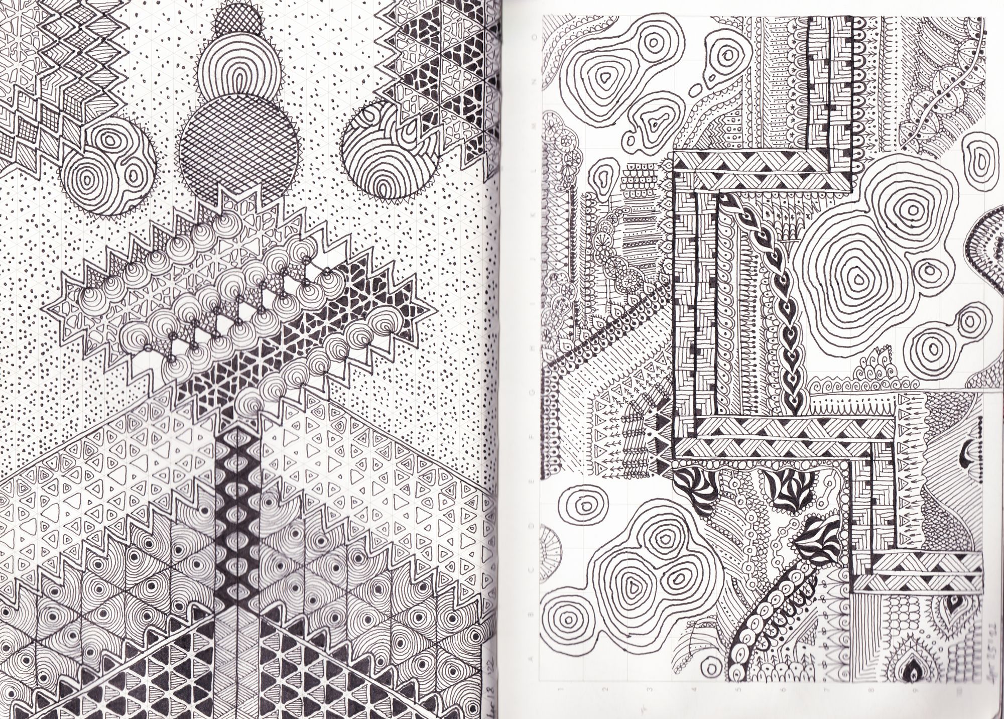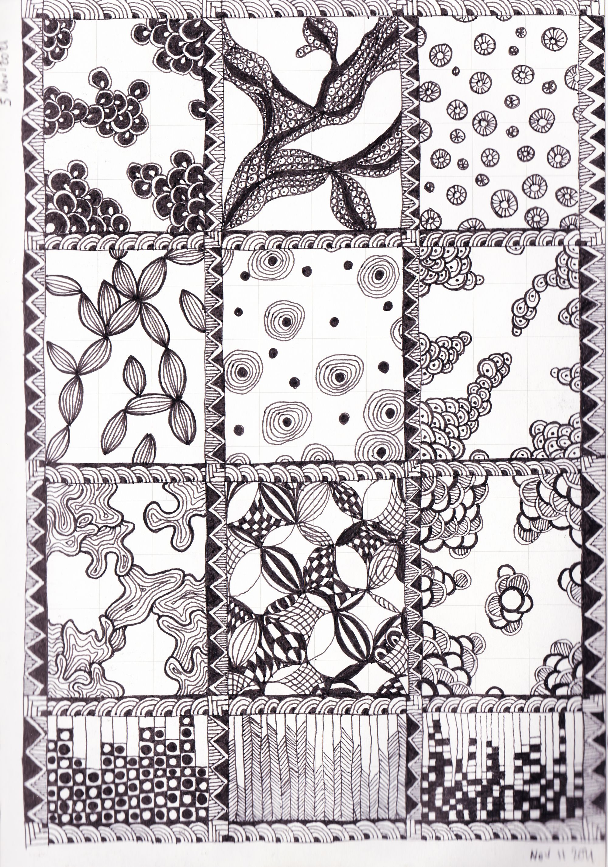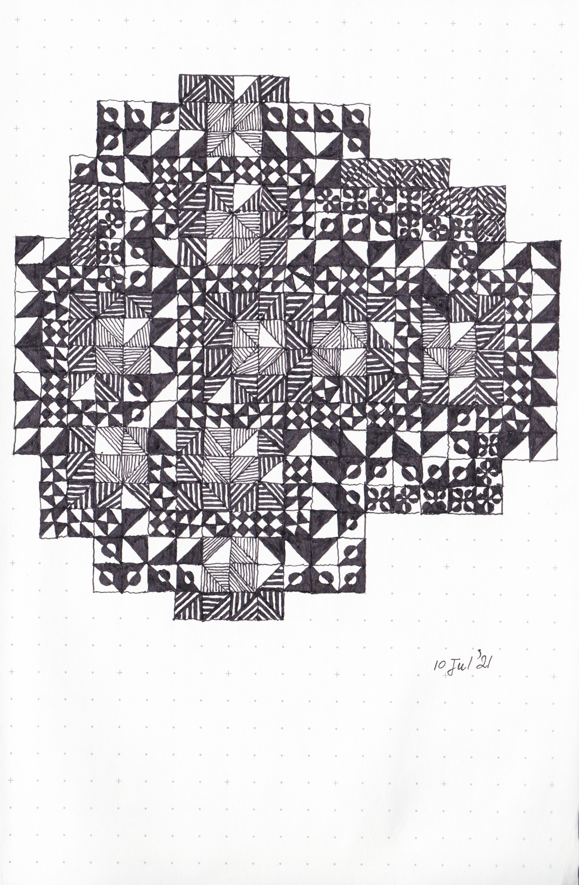 I remembered about a technique I used to practice when I was a teenager - very simple ink patterning - and I become curious if I can develop it further. I saw works of great masterity using the technique in Collection de l'Art Brut in Lausanne so I had a good inspiration too.